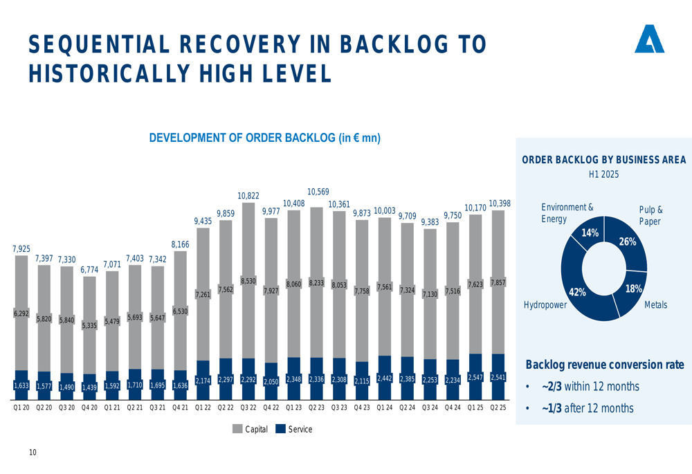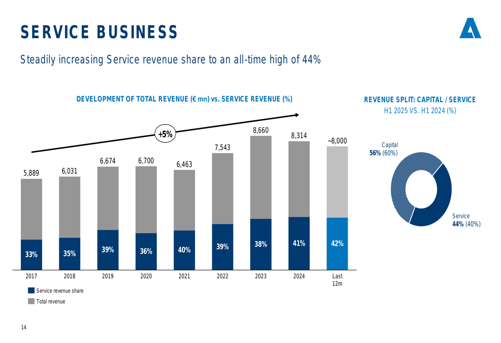 Andritz continued to execute its strategic initiatives focused on service business growth and complementary acquisitions. The service revenue share reached an all-time high of 44% in H1 2025, up from 40% in H1 2024, contributing to stable profitability despite revenue challenges.