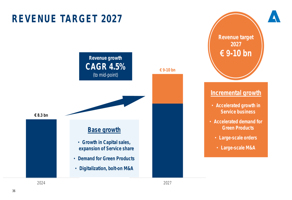 For the medium term, Andritz confirmed its 2027 targets of €9-10 billion in revenue and a comparable EBITA margin exceeding 9%. The revenue growth is expected to come from both base growth (expansion of service share, demand for green products, digitalization, and bolt-on acquisitions) and incremental growth opportunities (accelerated service business growth, increased demand for green products, large-scale orders, and major acquisitions).