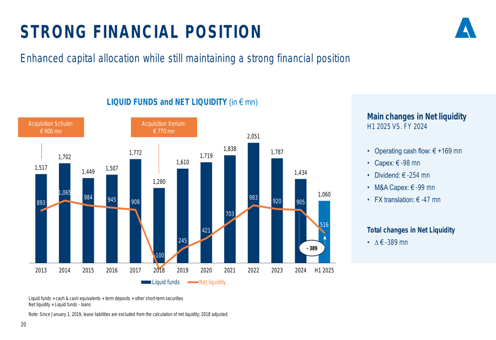 Andritz maintained a strong financial position with positive net liquidity, though it decreased compared to FY 2024 due to operating cash flow (+€169 million), offset by capital expenditure (-€98 million), dividend payments (-€254 million), M&A investments (-€99 million), and FX translation effects (-€47 million).