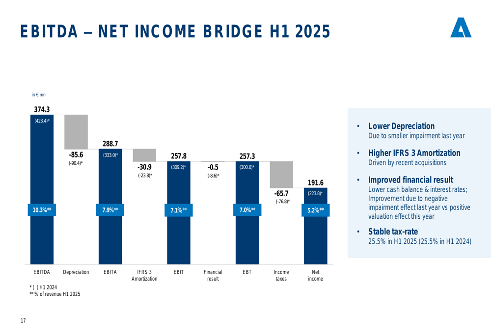 The company’s EBITDA to net income bridge for H1 2025 shows the components contributing to the final result:
