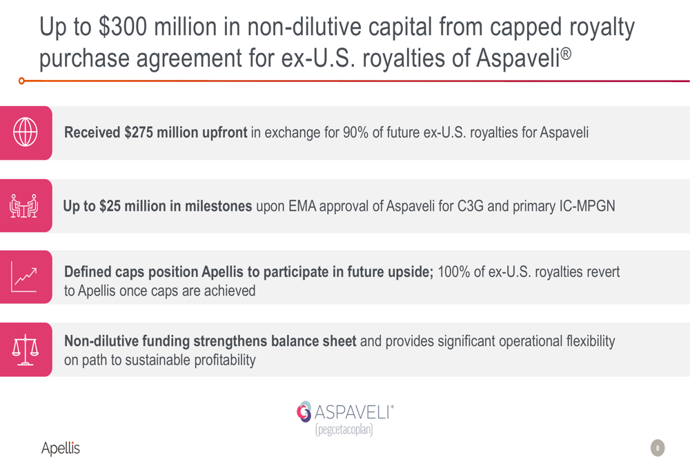 Apellis significantly strengthened its balance sheet through a royalty purchase agreement for ex-U.S. royalties of Aspaveli. The company received $275 million upfront in exchange for 90% of future ex-U.S. royalties, with the potential for an additional $25 million in milestones upon EMA approval of Aspaveli for C3G and primary IC-MPGN.
