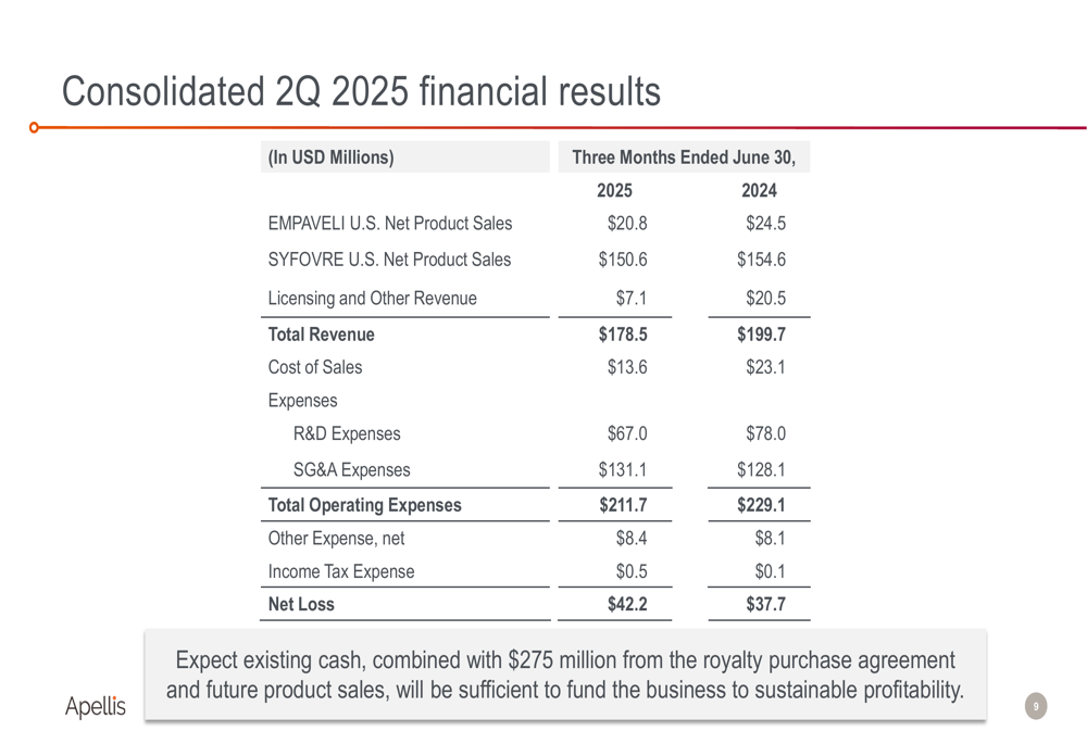 Apellis reported total revenue of $178.5 million for Q2 2025, down from $199.7 million in the same period last year. SYFOVRE generated approximately $151 million in revenue from geographic atrophy treatments, while EMPAVELI contributed about $21 million from PNH treatments. Despite the year-over-year revenue decline, the company highlighted a 6% quarter-over-quarter growth in SYFOVRE injections.