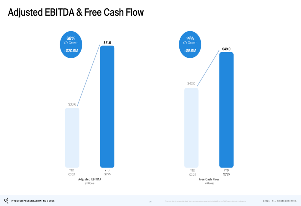 This margin expansion demonstrates the scalability of Arlo's platform and the improving economics of its subscription business. The company's profitability metrics have also shown substantial improvement, with adjusted EBITDA increasing 68% year-over-year to $51.5 million (YTD Q3'25) and free cash flow growing 14% to $49 million for the same period: