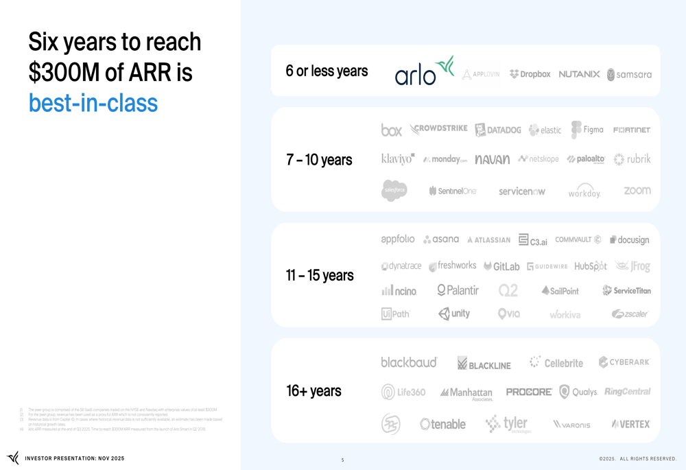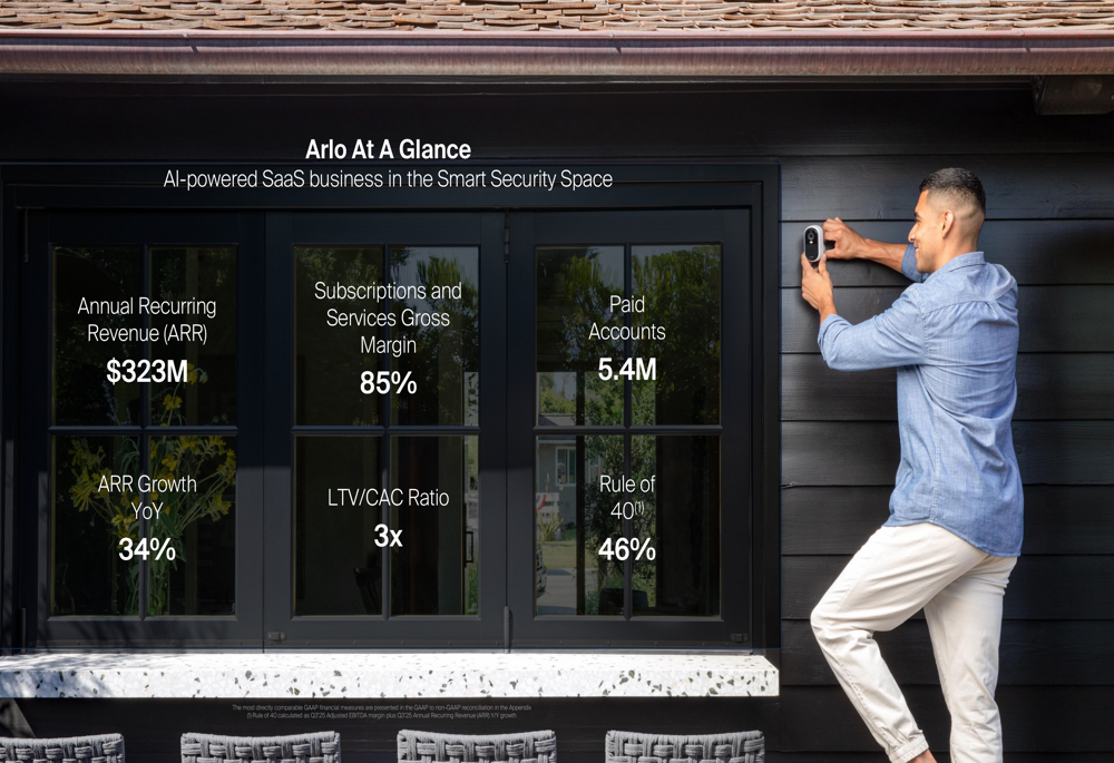 Arlo reported impressive SaaS metrics for Q3 2025, achieving what it calls "Rule of 40+" performance for two consecutive quarters. The company highlighted its annual recurring revenue (ARR) of $323 million, representing 34% year-over-year growth, alongside a subscription and services gross margin of 85%.