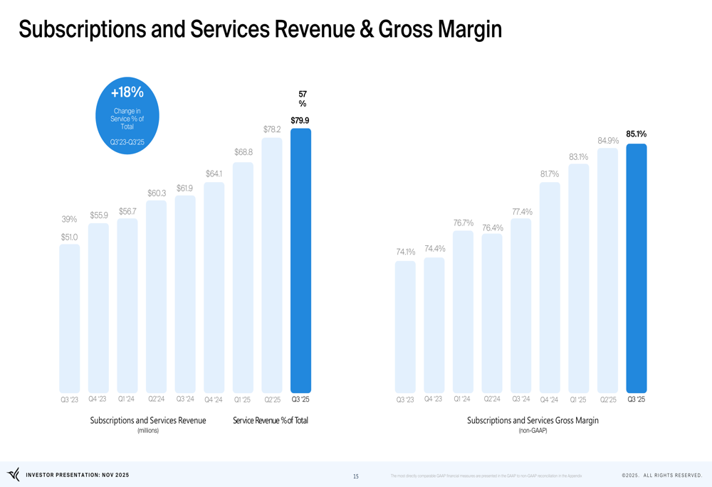 The company's subscription and services revenue has similarly shown strong growth, reaching $79.9 million in Q3 2025, a 29% increase year-over-year according to the earnings report. More importantly, the gross margin for this segment has expanded significantly, reaching 85.1% in Q3 2025 compared to 74.1% in Q3 2023: