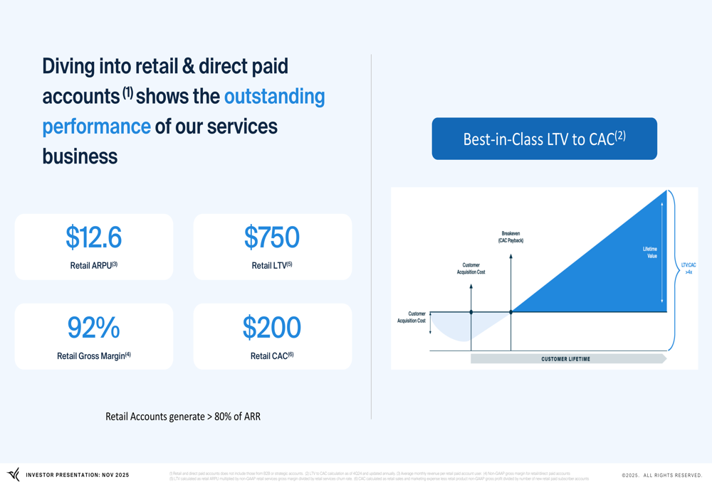 Retail accounts have emerged as a key driver of Arlo's business, generating over 80% of ARR with attractive unit economics. These accounts deliver a $12.6 average revenue per user (ARPU), a lifetime value of $750, and a gross margin of 92%, resulting in a lifetime value to customer acquisition cost ratio of nearly 4x: