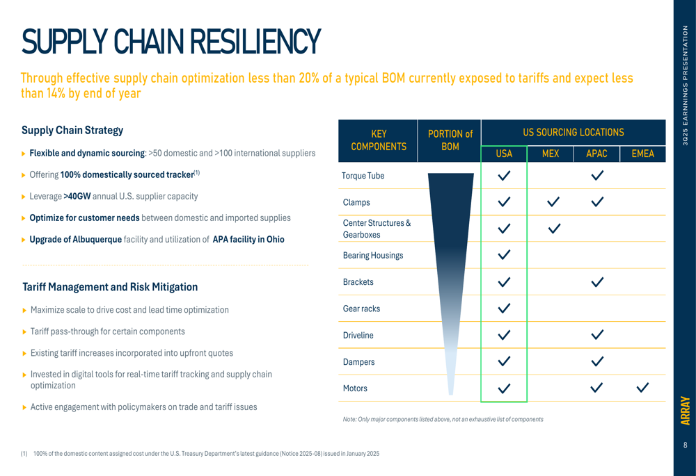 Array Technologies has made significant progress in optimizing its supply chain to mitigate tariff exposure. Currently, less than 20% of a typical bill of materials is exposed to tariffs, with expectations to reduce this further to less than 14% by year-end.