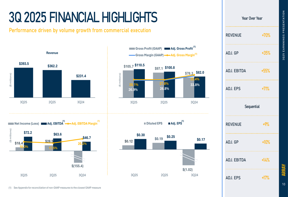Array Technologies reported revenue of $393.5 million for Q3 2025, representing a 70% increase year-over-year and a 9% improvement sequentially from Q2 2025. This robust growth was primarily driven by increased market share and the successful adoption of new products.