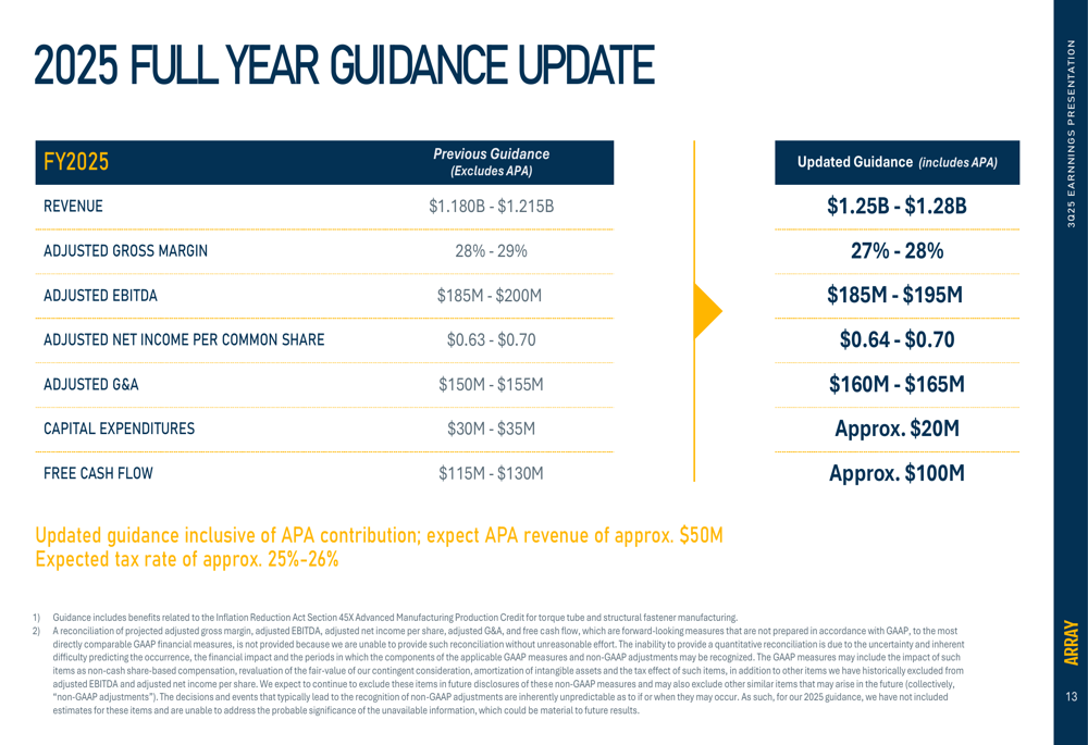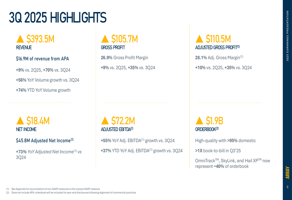 Based on its strong performance through the first three quarters, Array Technologies has raised its full-year 2025 guidance. The updated outlook now includes the contribution from APA Solar: