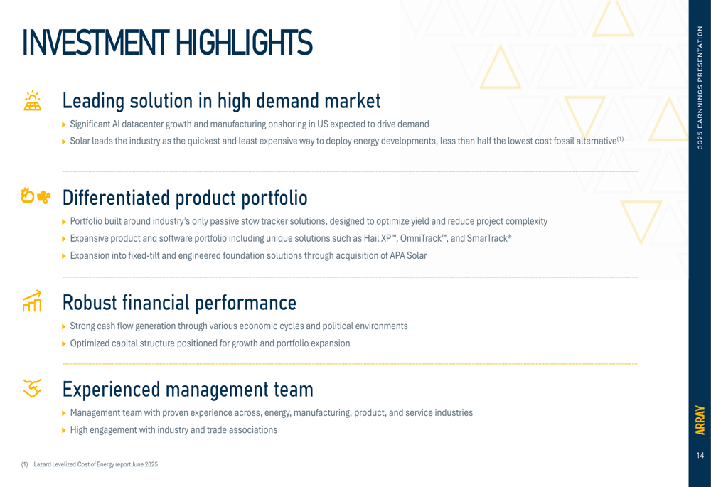 Array Technologies’ Q3 2025 results demonstrate the company’s ability to execute on its strategic initiatives while delivering strong financial performance. The 70% year-over-year revenue growth, improving margins, and healthy orderbook of $1.9 billion position the company well for continued success.