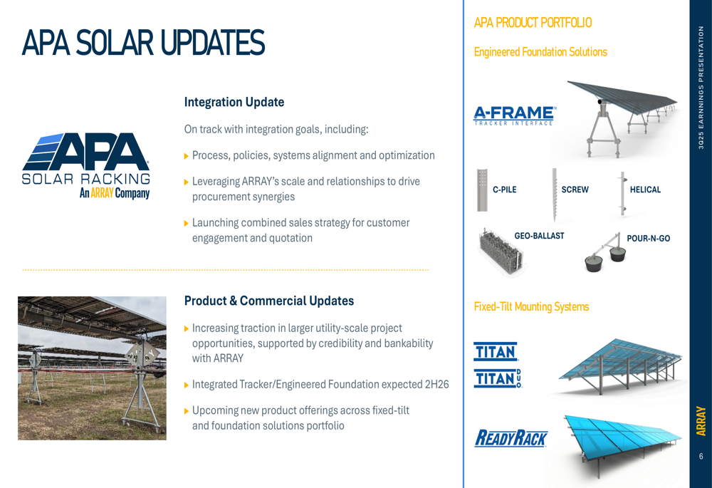 The integration of APA Solar, a recent acquisition, is progressing on schedule. Management reported that they are aligning processes, policies, and systems while leveraging Array’s scale and relationships to drive procurement synergies. The acquisition expands Array’s product portfolio to include engineered foundation solutions and fixed-tilt mounting systems.