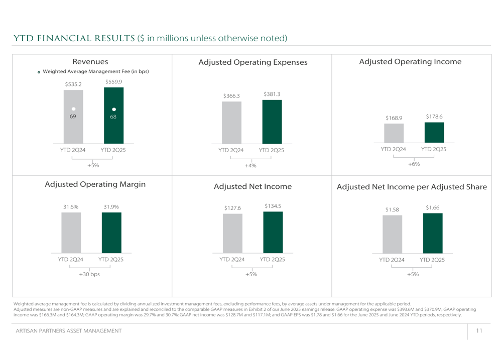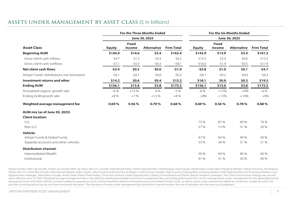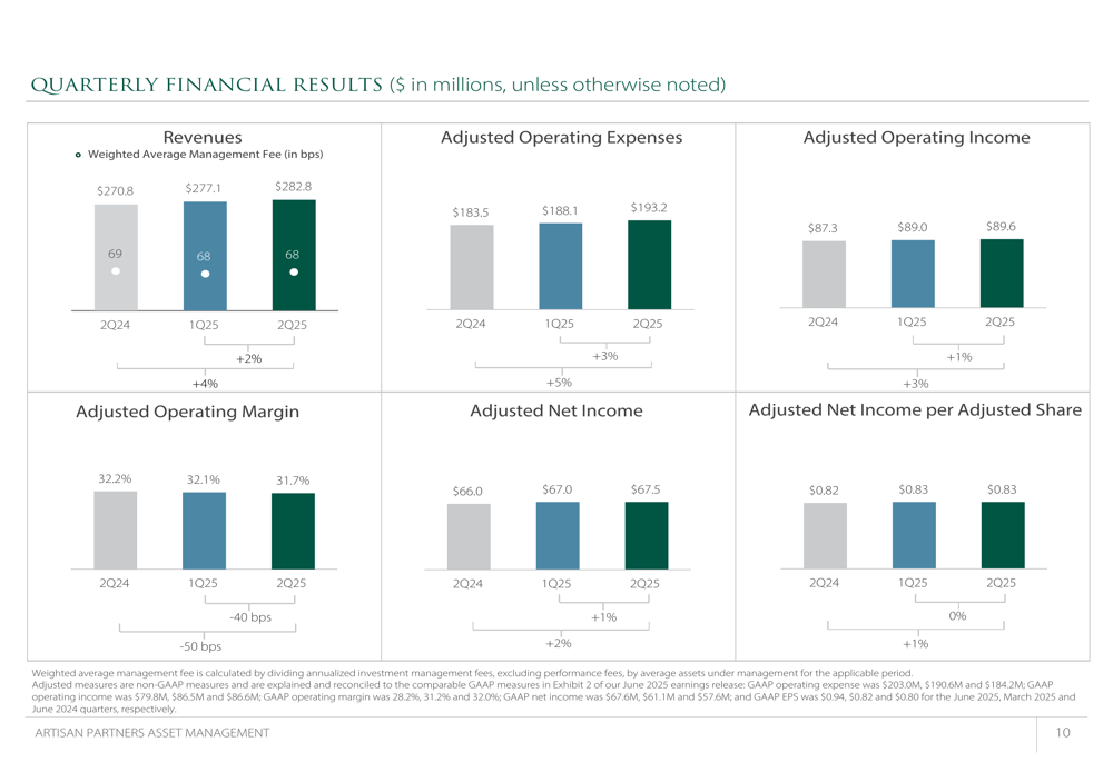 Artisan Partners reported Q2 2025 revenue of $282.8 million, up 4.4% from $270.8 million in Q2 2024, driven primarily by higher average AUM. The company maintained a weighted average management fee of 68 basis points, showing only a slight decline from 69 basis points in the prior-year period.