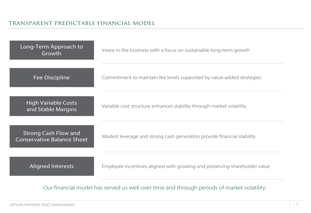 Artisan Partners has maintained a consistent business philosophy centered on three pillars: being a high value-added investment firm, employing a talent-driven business model, and pursuing thoughtful growth. This approach has guided the company from its founding with a single investment team in 1995 to its current structure with 11 investment teams managing 26 strategies.