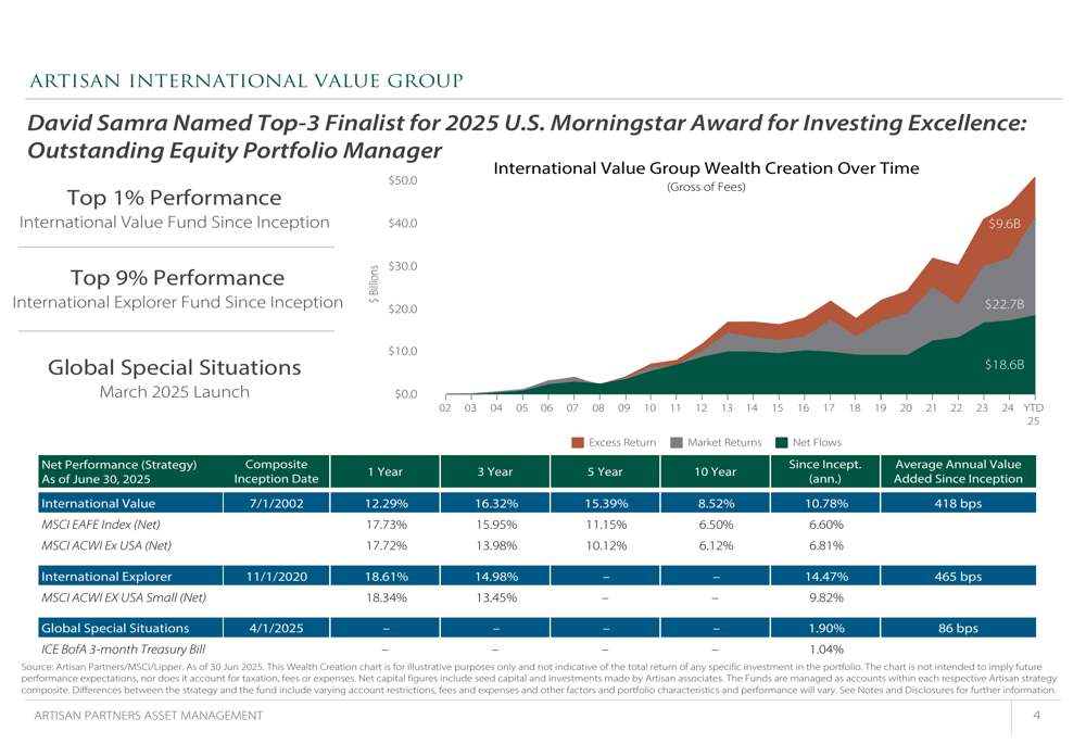 The International Value Group, led by David Samra (a Top-3 Finalist for a 2025 U.S. Morningstar Award), has delivered particularly strong results, with average annual value added of 418 basis points since inception:
