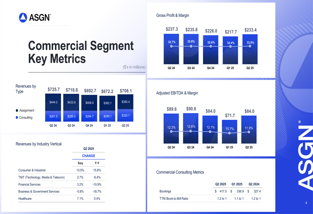 Within the Commercial segment, assignment revenue (traditional staffing) showed significant weakness, while consulting revenue demonstrated more resilience. Commercial consulting bookings reached $417.5 million in Q2 2025, with a trailing twelve-month book-to-bill ratio of 1.2 to 1, indicating a healthy pipeline for future business.