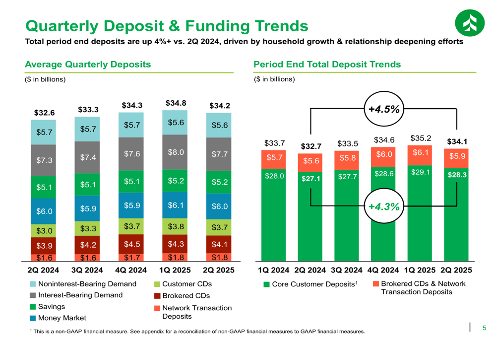 Core customer deposits, which represent 83% of total deposits, followed a similar pattern, decreasing 2.9% from the previous quarter but growing 4.3% year-over-year. The bank maintains a stable and granular deposit base, with liquidity sources covering 173% of uninsured, uncollateralized deposits as of June 30, 2025.