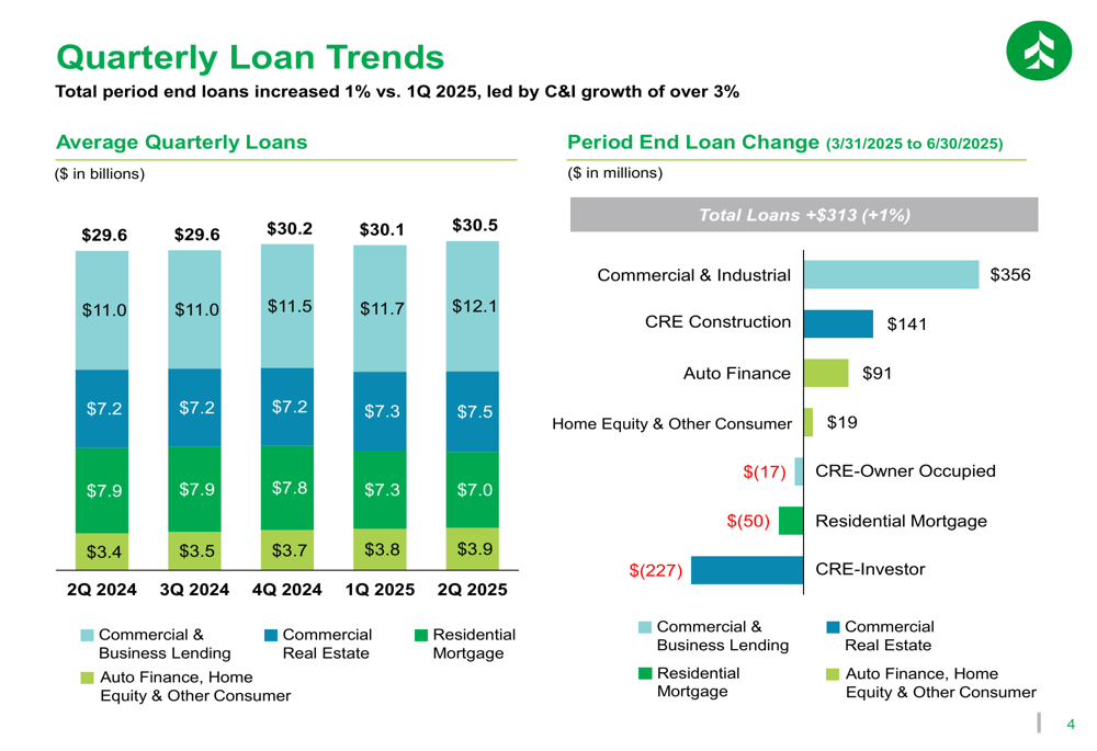 Period-end loan changes from Q1 to Q2 2025 show C&I loans increased by $356 million, while CRE-investor loans decreased by $227 million, reflecting the bank’s deliberate portfolio rebalancing. The bank has been strategically reducing its residential mortgage concentration, which now represents 22.7% of total loans, down from 23.1% in Q1 2025 and 31.2% in 2021.