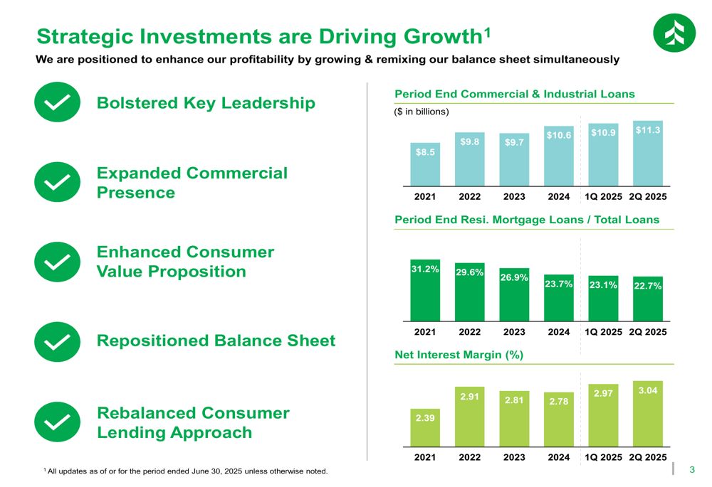 Total loans grew to $30.6 billion, up 3.3% year-over-year, while deposits increased to $34.1 billion, representing 4.5% growth compared to the same period last year. The efficiency ratio improved to 55.8%, down from 59.5% in Q2 2024, reflecting the company’s focus on operational efficiency.