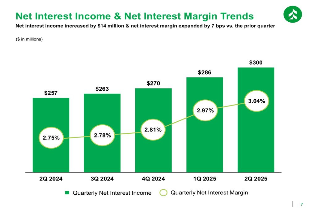This margin expansion was driven by a 5 basis point increase in earning asset yields and a 4 basis point decrease in interest-bearing liability costs. The bank’s strategic investments and balance sheet repositioning have contributed significantly to this improvement, as illustrated in the following chart: