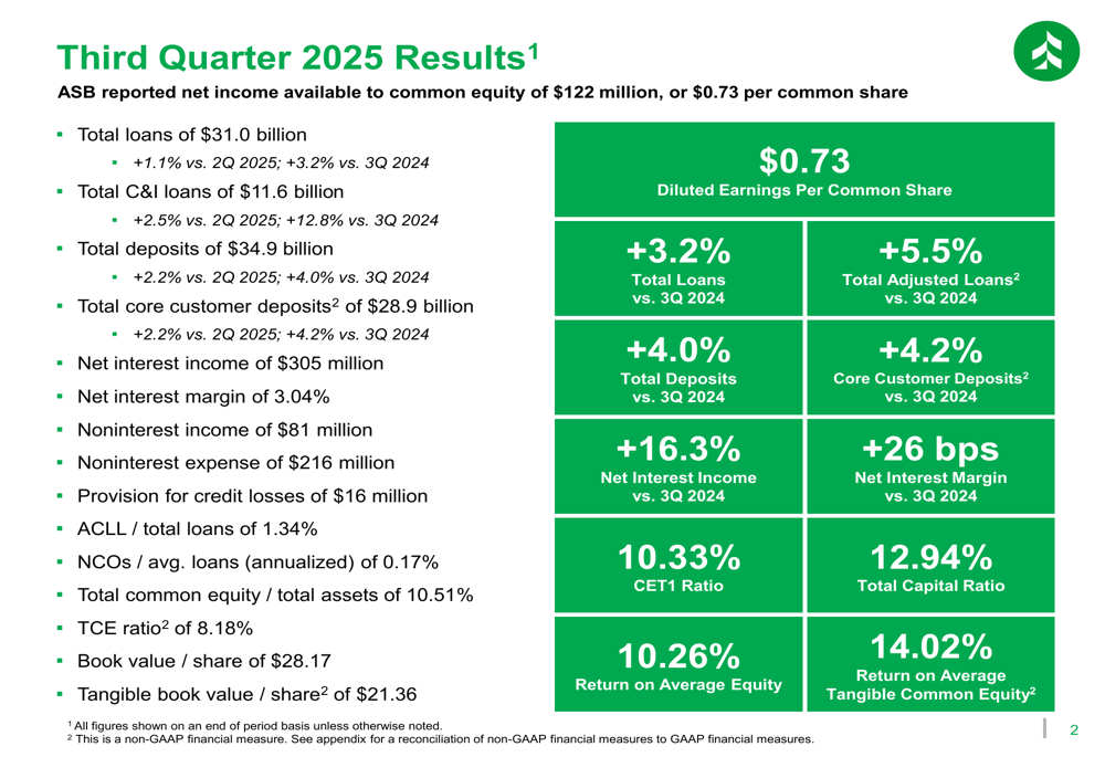 Associated Banc-Corp reported net income of $122 million or $0.73 per common share for Q3 2025. The bank achieved record net interest income of $305 million, representing a 16.3% increase compared to the same period last year, while maintaining a stable net interest margin of 3.04%.