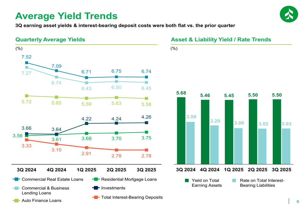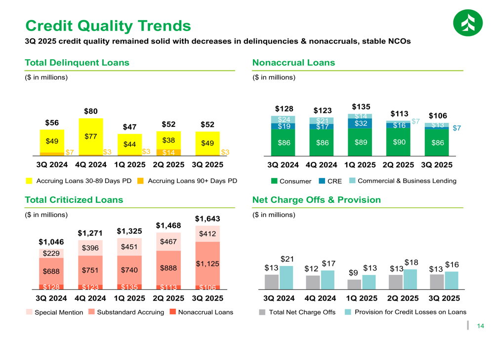 The bank has seen an increase in criticized loans, which grew to $1.64 billion in Q3 2025 from $1.05 billion a year earlier. While this hasn’t translated into higher delinquencies or charge-offs yet, it bears monitoring as a potential early warning sign.