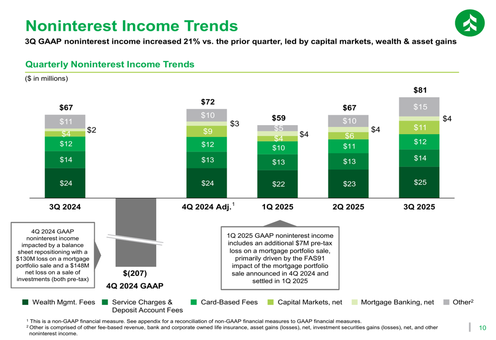 Wealth management revenue reached $25 million, while capital markets income more than doubled from $5 million in Q1 2025 to $11 million in Q3 2025, demonstrating the bank’s success in diversifying revenue streams.