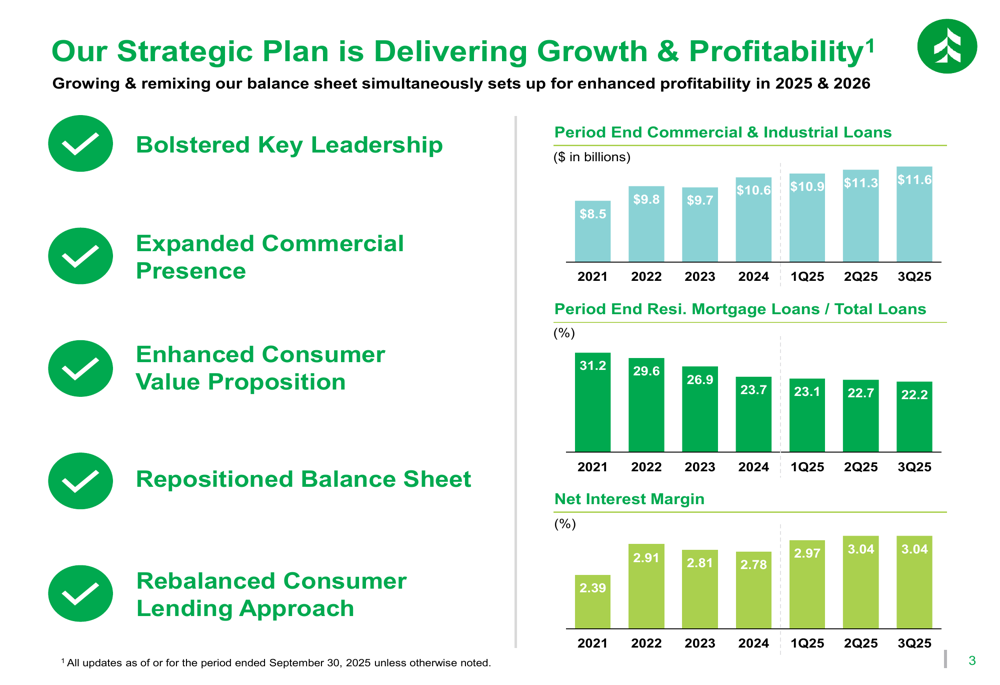 C&I loans have grown steadily from $8.5 billion in 2021 to $11.6 billion in Q3 2025, while residential mortgage loans as a percentage of total loans have decreased from 31.2% in 2021 to 22.2% in Q3 2025. This shift has contributed to the improvement in net interest margin from 2.39% in 2021 to the current 3.04%.