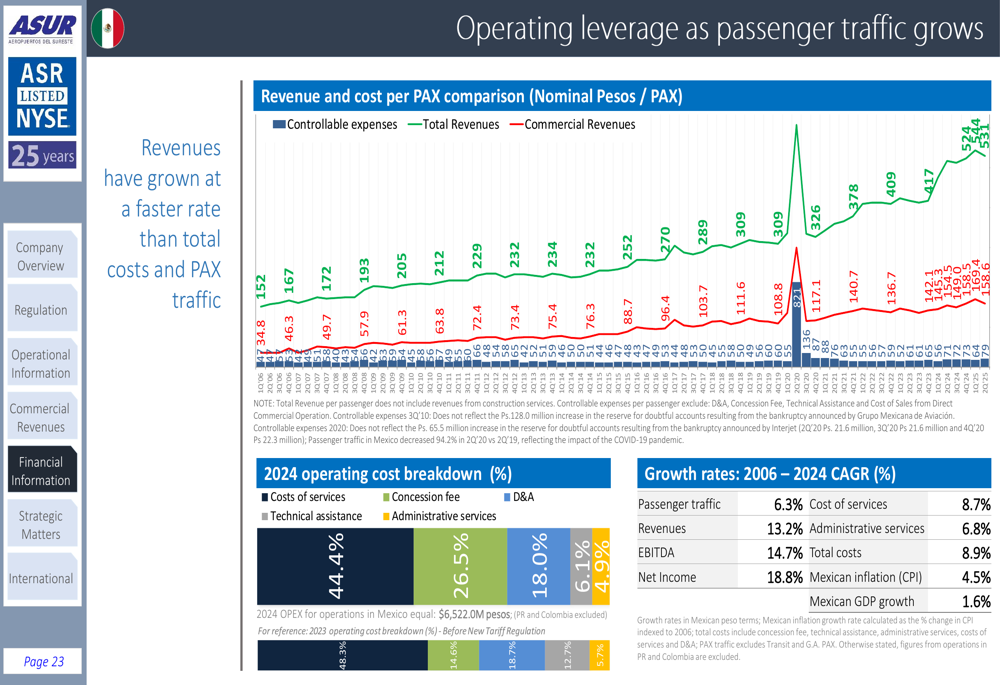Financial performance remains strong, with 2024 total revenues reaching Ps.20,972 million and revenue per passenger at Ps.506.3. The company maintains a healthy balance between aeronautical revenues (66.4%) and non-aeronautical revenues (33.6%), with Cancún Airport generating nearly 80% of total revenue.