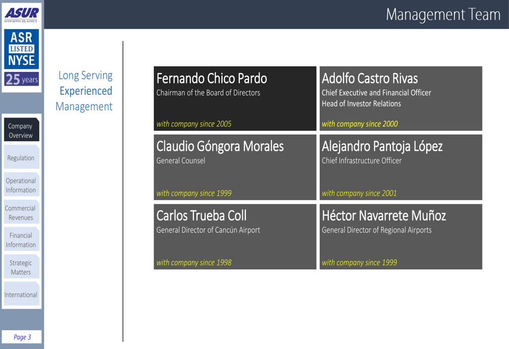 The company’s management team, led by Fernando Chico Pardo (Chairman) and Adolfo Castro Rivas (CEO and CFO), brings decades of experience in airport operations, with most executives having served with ASUR for over 20 years: