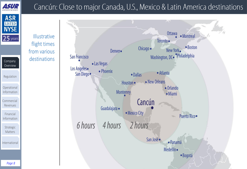 Cancún International Airport, ASUR’s flagship operation, benefits from strategic positioning with convenient flight times to major destinations throughout North and Latin America:
