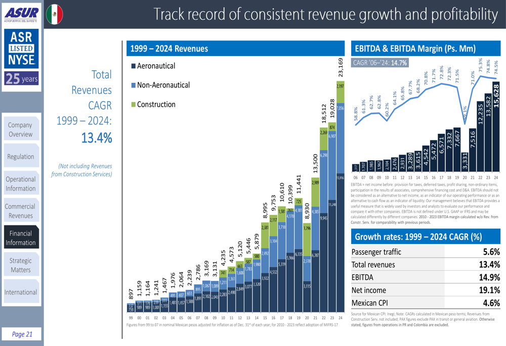 ASUR has demonstrated consistent revenue growth and strong profitability over its history. From 1999 to 2024, the company achieved impressive growth in both revenues and EBITDA, maintaining healthy EBITDA margins throughout this period: