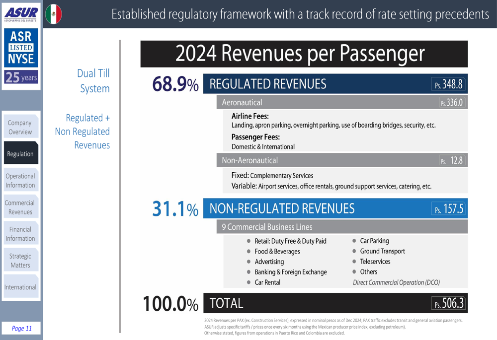 Revenue diversification has been a key strength for ASUR. In 2024, the revenue breakdown shows a balance between regulated revenues (68.9%) and non-regulated revenues (31.1%), providing stability and growth opportunities:
