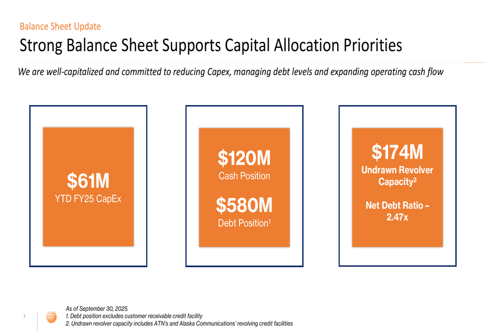 ATN's balance sheet showed improvement during the quarter, with the company making progress on its deleveraging goals. As of September 30, 2025, ATN reported: