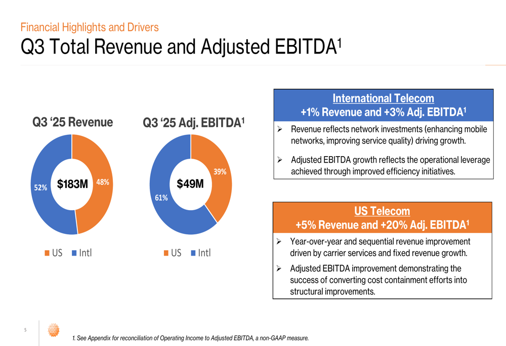 ATN reported Q3 2025 total revenue of $183 million, representing a 3% year-over-year increase. Adjusted EBITDA reached $49 million, showing solid improvement from the previous year. The results exceeded analyst expectations, with earnings per share of $0.18 surpassing the forecast of $0.12 by 50%.