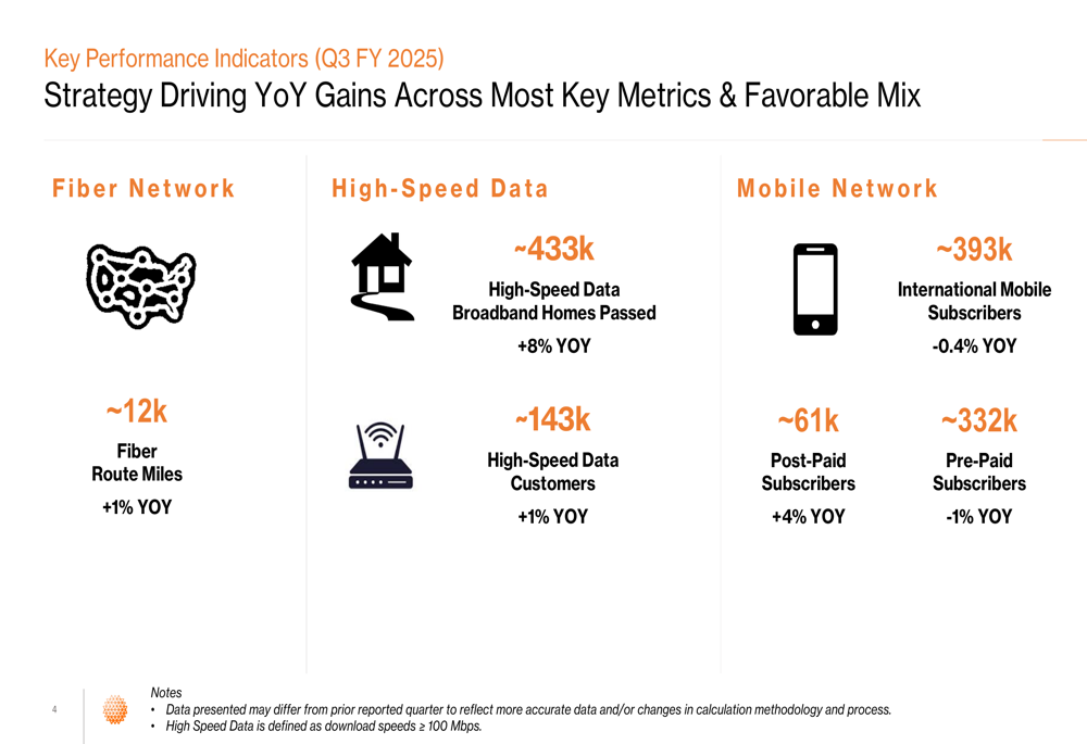 High-speed data continued to be a growth area with broadband homes passed increasing 8% year-over-year to approximately 433,000, while high-speed data customers grew 1% to around 143,000. Mobile subscribers showed divergent trends with post-paid subscribers growing 4% year-over-year to approximately 61,000, while pre-paid subscribers declined 1% to about 332,000.