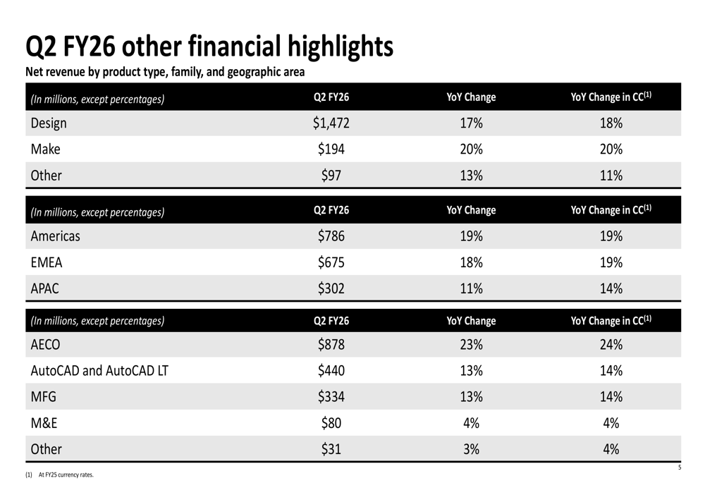 Autodesk delivered impressive financial results across all key metrics in Q2 FY26. Revenue reached $1.76 billion, representing 17% year-over-year growth, while billings surged 36% to $1.68 billion. The company also demonstrated significant margin improvements, with GAAP operating margin increasing by 2 percentage points to 25% and non-GAAP operating margin rising 1 percentage point to 39%.