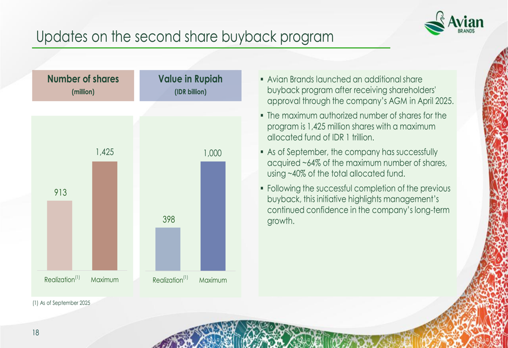 Avian Brands continued to execute its second share buyback program, which was approved by shareholders in April 2025. As of September 2025, the company had acquired 913 million shares (64% of the maximum authorized) at a total value of IDR 398 billion (40% of the allocated fund).