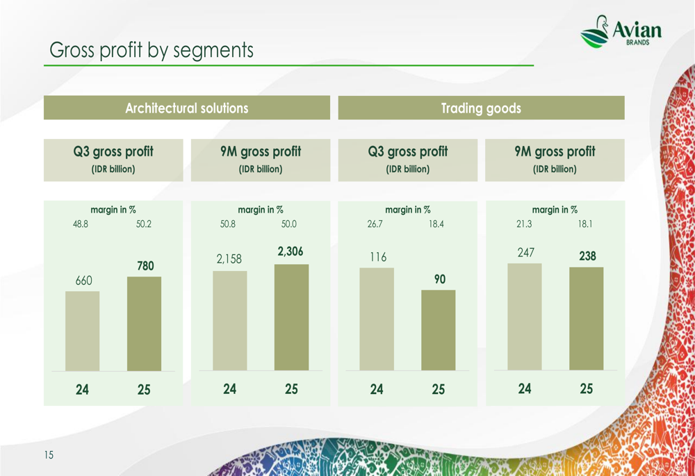 The breakdown of gross profit by segment shows the contrasting performance between architectural solutions and trading goods:
