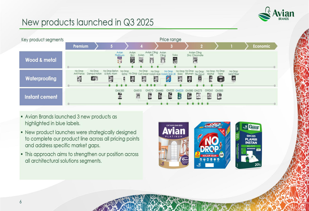 During Q3 2025, Avian Brands launched several new products across its key segments, strategically designed to complete its product lines across all price points. The company introduced new offerings in wood and metal coatings, waterproofing solutions, and instant cement products.