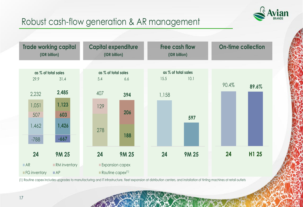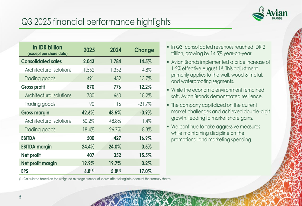 Avian Brands delivered strong growth across all key financial metrics in Q3 2025. Net profit increased by 15.5% year-over-year to IDR 407 billion, with a net profit margin of 19.9%. EBITDA grew by 16.9% to IDR 500 billion, resulting in an EBITDA margin of 24.4%.