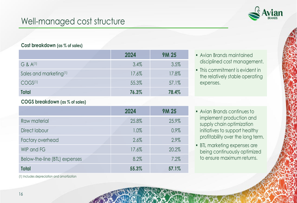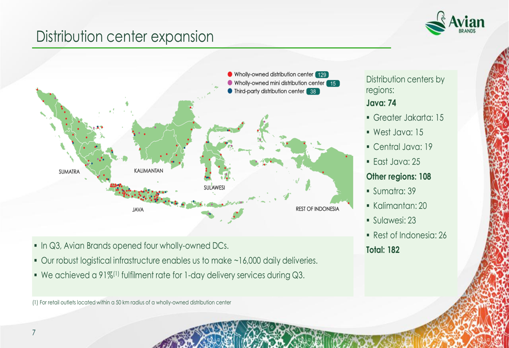 Avian Brands continued to strengthen its distribution infrastructure, opening four wholly-owned distribution centers during the quarter. The company now operates 182 distribution centers across Indonesia, with 129 wholly-owned distribution centers, 15 wholly-owned mini distribution centers, and 38 third-party distribution centers.