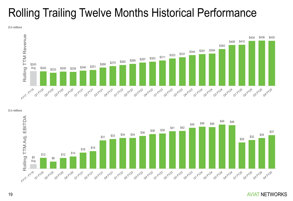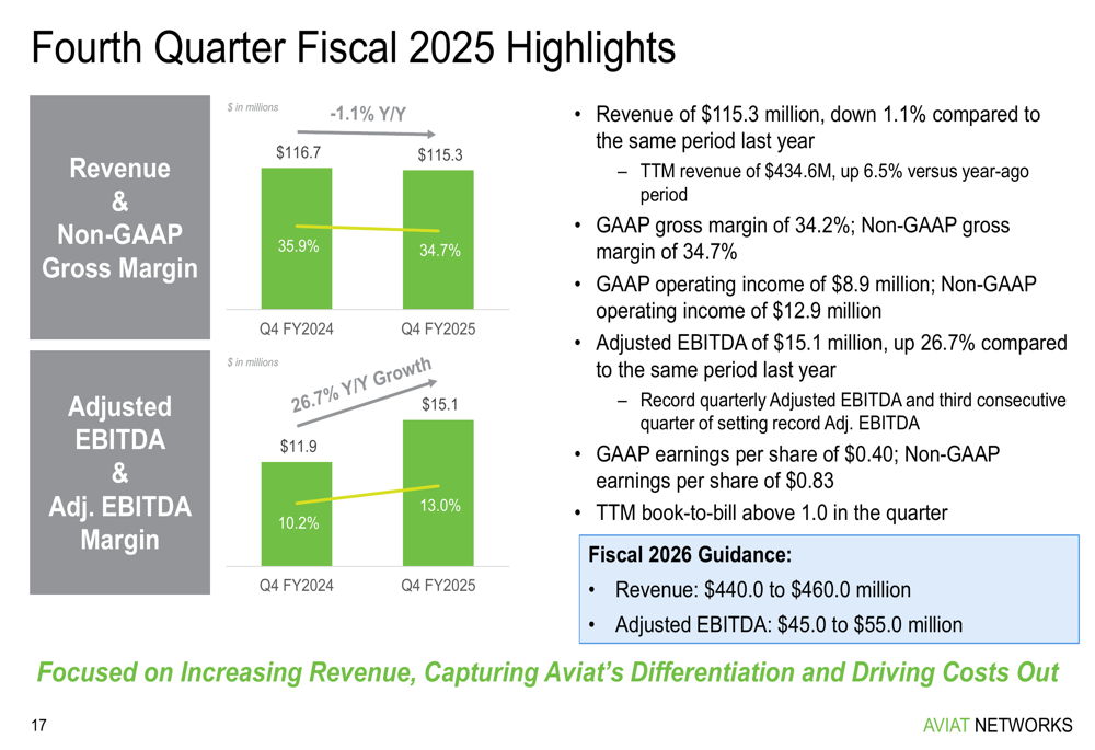 Looking ahead to fiscal 2026, Aviat Networks provided guidance for revenue between $440.0 million and $460.0 million, with adjusted EBITDA projected to range from $45.0 million to $55.0 million. This outlook suggests continued revenue growth and improved profitability compared to fiscal 2025.