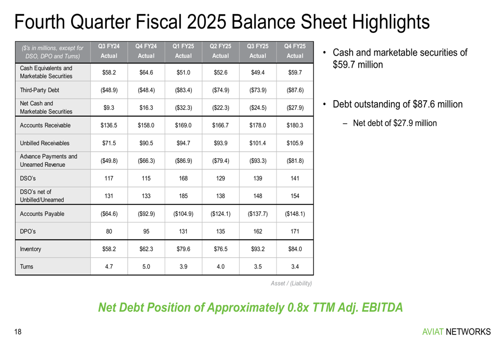 Aviat’s balance sheet position as of Q4 2025 shows $59.7 million in cash and marketable securities against $87.6 million in third-party debt, resulting in a net debt position of approximately 0.8x TTM adjusted EBITDA. The company reported accounts receivable of $180.3 million with DSOs (Days Sales Outstanding) at 141 days and inventory turns at 3.4x.
