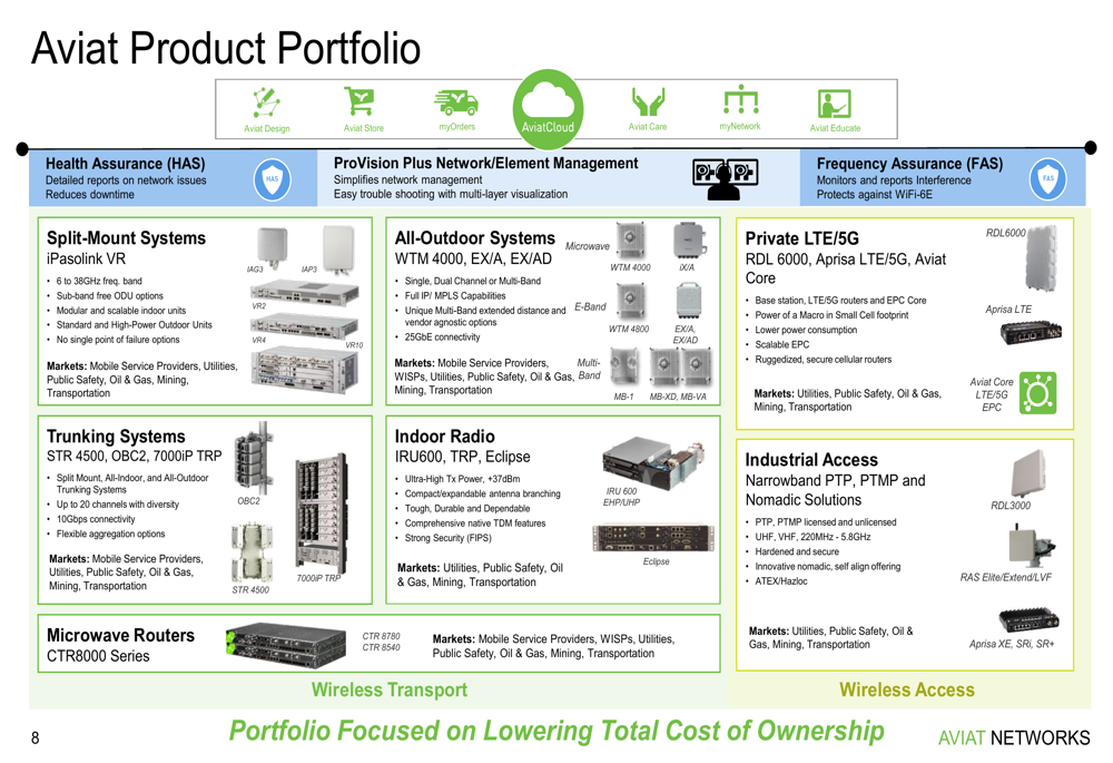 Aviat’s strategy focuses on providing value through reduced tower footprint, capacity scalability, integrated routing, spectrum fee savings, higher network reliability, and simplified logistics. The company emphasizes that its solutions deliver the lowest total cost of ownership in the industry.
