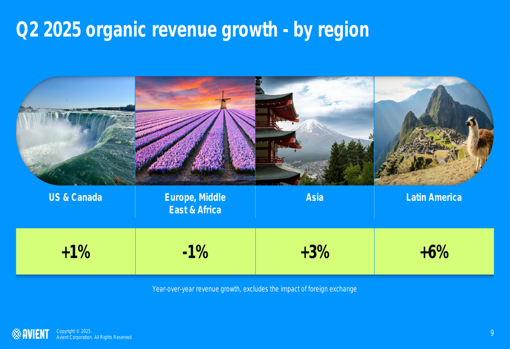 Regional performance varied significantly, with Latin America leading growth at 6%, followed by Asia at 3% and US & Canada at 1%, while Europe, Middle East, and Africa experienced a 1% decline in organic revenue.