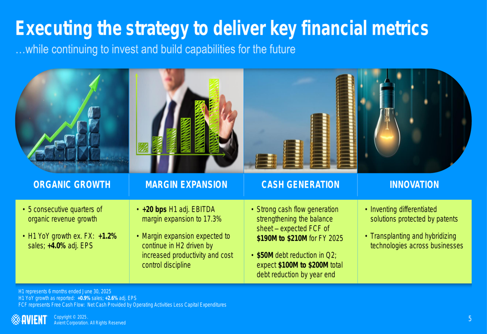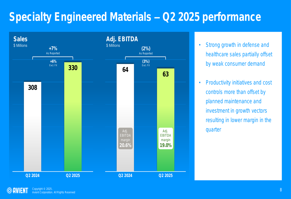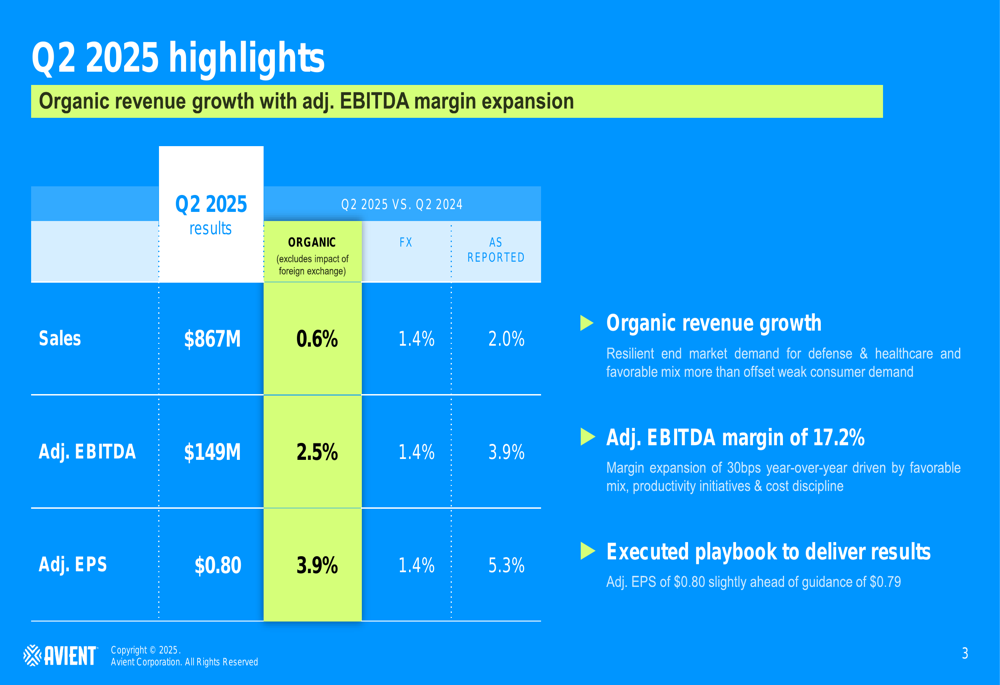 Avient reported Q2 2025 sales of $867 million, representing organic growth of 0.6% and reported growth of 2.0% when including favorable foreign exchange impacts of 1.4%. Adjusted EBITDA reached $149 million, with organic growth of 2.5% and reported growth of 3.9%. The company achieved an adjusted EBITDA margin of 17.2%, reflecting a 30 basis point year-over-year expansion.