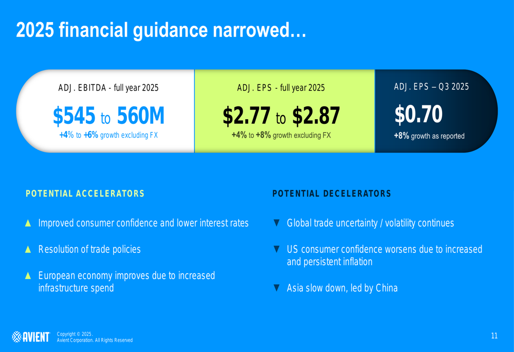 Avient has narrowed its full-year 2025 financial guidance, projecting adjusted EBITDA between $545 million and $560 million, representing 4% to 6% growth excluding foreign exchange impacts. The company expects adjusted EPS between $2.77 and $2.87, reflecting 4% to 8% growth excluding foreign exchange. For Q3 2025, Avient forecasts adjusted EPS of $0.70, representing 8% growth as reported.