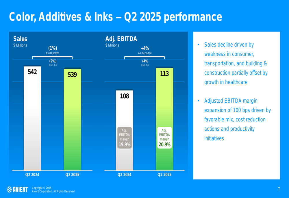 Avient’s two main business segments showed divergent performance in Q2 2025. The Color, Additives & Inks (CAI) segment, which represents approximately 63% of total sales, reported revenue of $538.6 million, a decrease of 1% as reported and 2% excluding foreign exchange effects. However, the segment’s adjusted EBITDA increased by 4% to $113 million, with margins expanding 100 basis points to 20.9%.