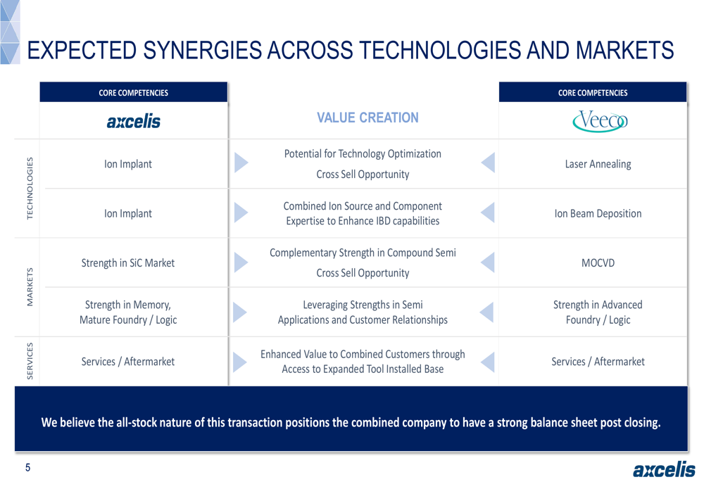 As illustrated in the following slide, the merger would combine Axcelis’ core competencies in ion implant with Veeco’s expertise in laser annealing, ion beam deposition, and MOCVD: