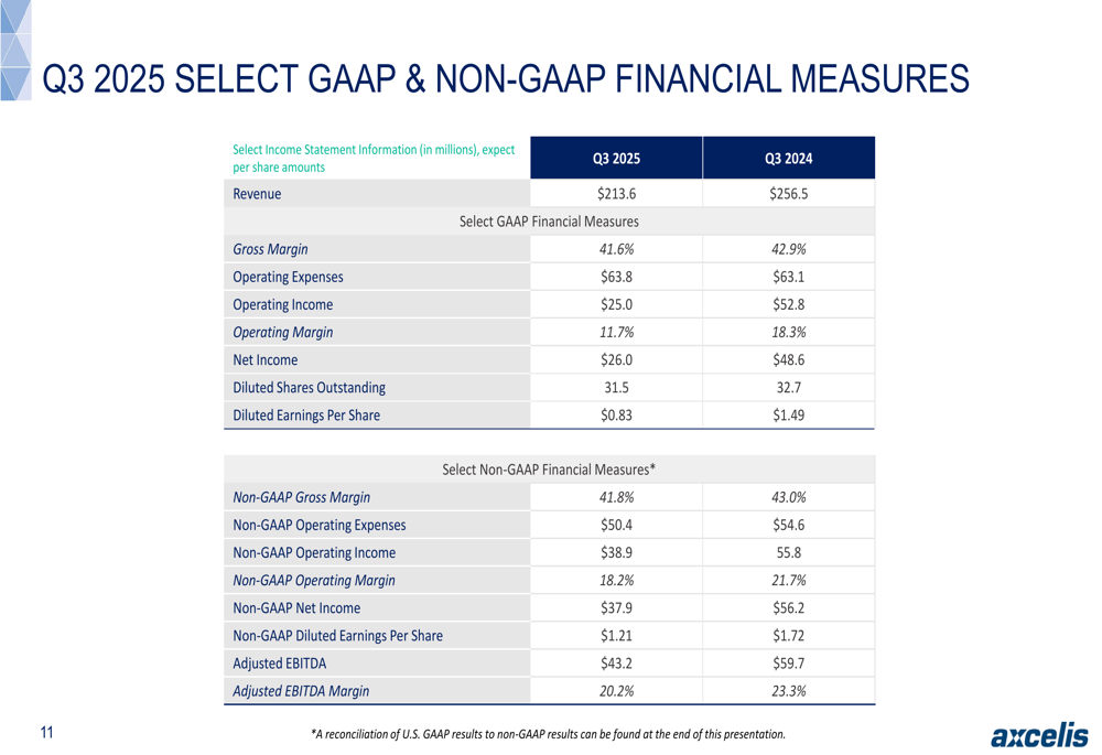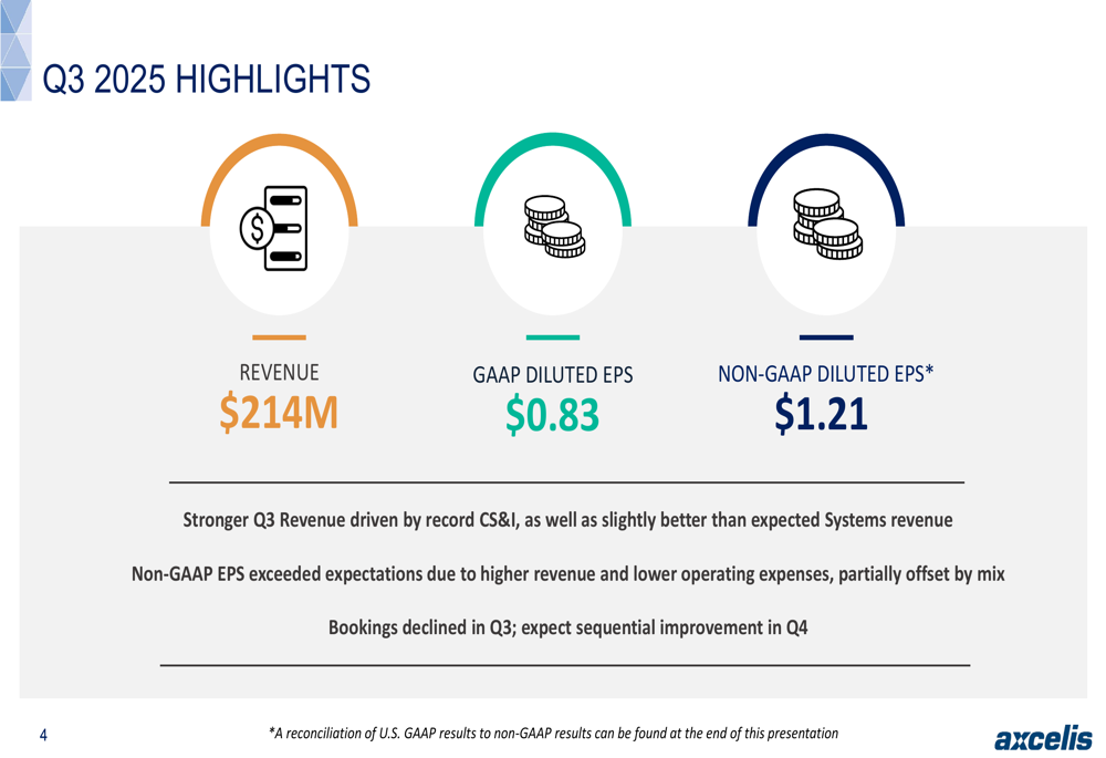 Axcelis reported Q3 2025 revenue of $213.6 million, representing a 9.8% increase from the previous quarter’s $194.5 million, though still below the $256.6 million recorded in the same period last year. The company attributed the sequential improvement to record performance in its Customer Solutions and Innovation (CS&I) segment and better-than-expected systems revenue.